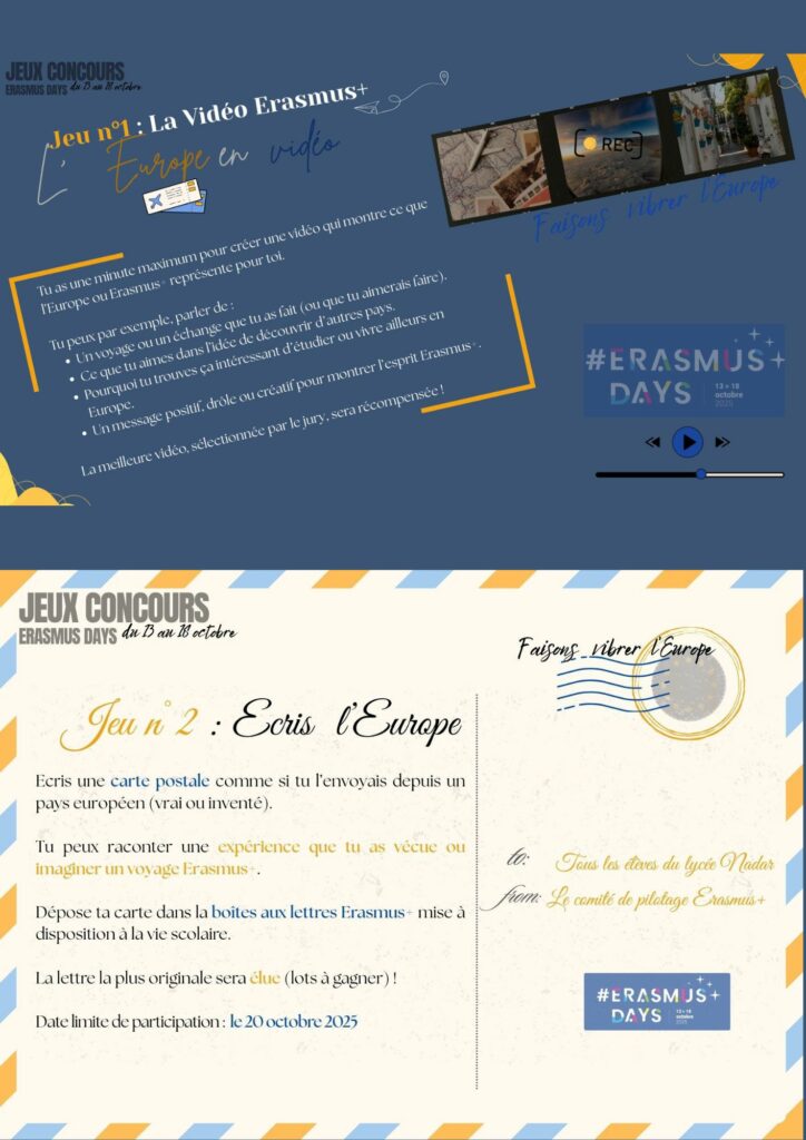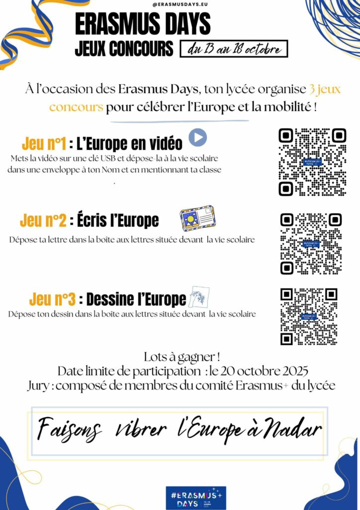 Le 17 octobre, le lycée Nadar organise son grand Cross annuel en partenariat avec les Erasmus Days ! Une belle occasion de partager un moment sportif, festif et européen autour des valeurs d’effort, de solidarité et d’ouverture. Nous vous attendons pour célébrer ce Cross Européen ! 🏃♂️🏃♀️✨