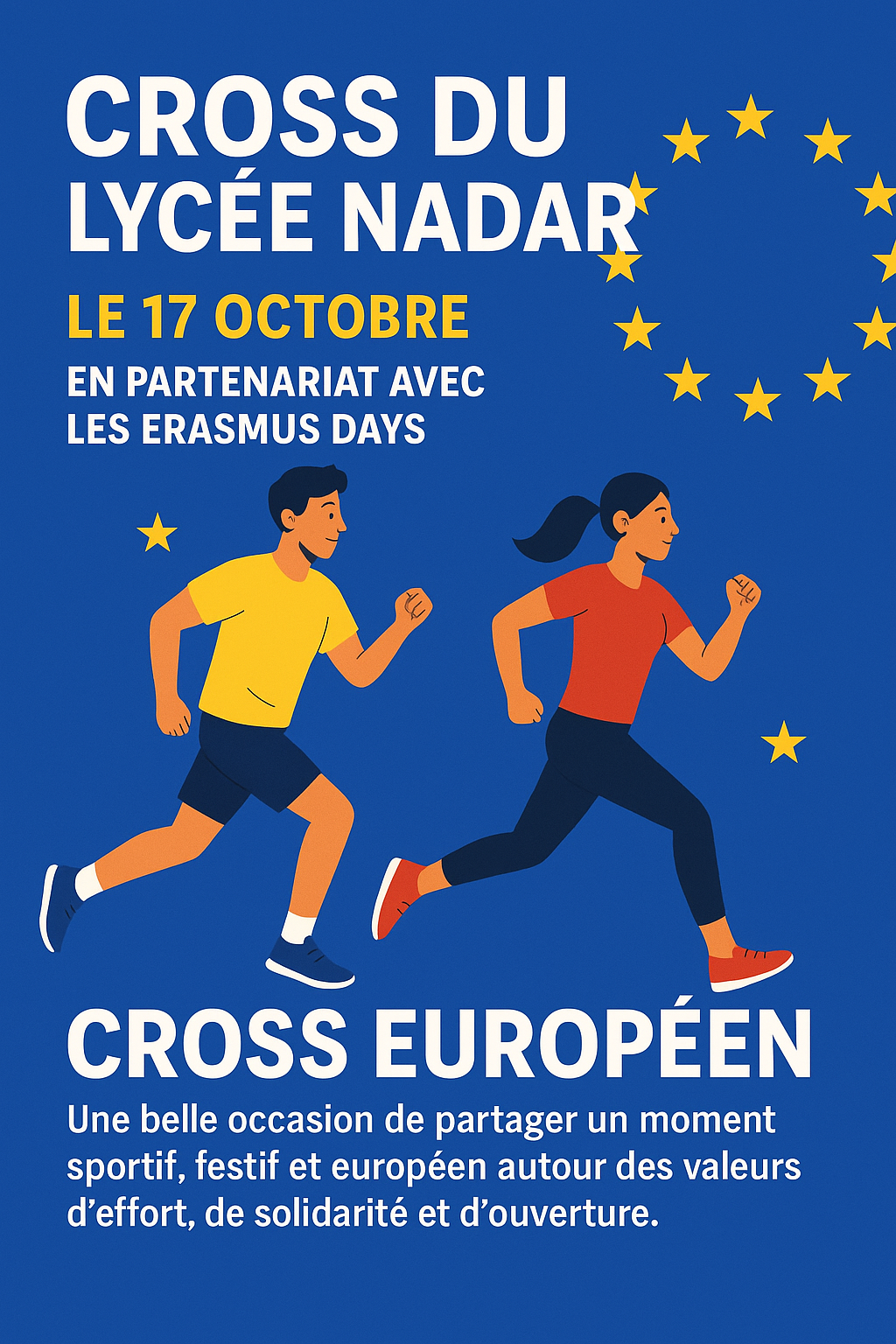 Le 17 octobre, le lycée Nadar organise son grand Cross annuel en partenariat avec les Erasmus Days ! Une belle occasion de partager un moment sportif, festif et européen autour des valeurs d’effort, de solidarité et d’ouverture. Nous vous attendons pour célébrer ce Cross Européen ! 🏃♂️🏃♀️✨